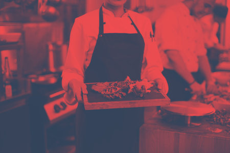 female Chef in hotel or restaurant kitchen holding grilled beef steak plate with vegetable decoration