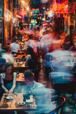 crowded restaurant or pub with people dining and waiters, bartender and chefs working, crowd drinking and eat in full bar or cafe, blurred motion. High quality photo