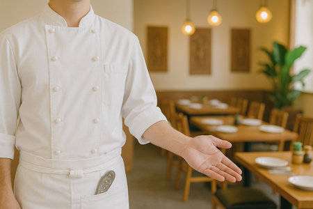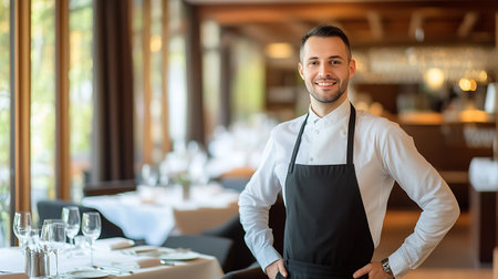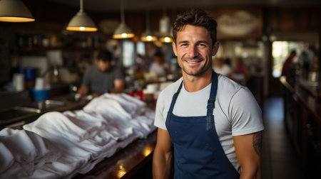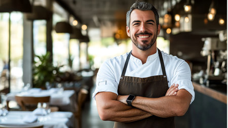 Proud restaurant owner managing a successful establishment, showcasing culinary excellence.