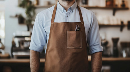 A barista in a brown apron stands in a cozy coffee shop, ready to serve customers during the bustling morning rush