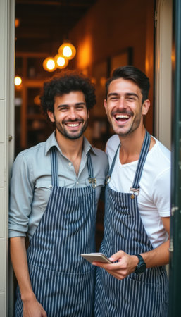 Two smiling men, one with curly hair and the other with a stylish haircut, stand at the entrance of their restaurant, exuding warmth and friendliness. Dressed in matching striped aprons, they invite patrons in with their joyful expressions, embodying the spirit of hospitality and camaraderie.