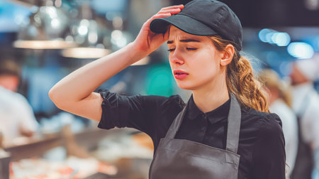 A young woman wearing a cap and apron stands in a bustling kitchen, visibly stressed and fatigued as she deals with the pressures of her job.