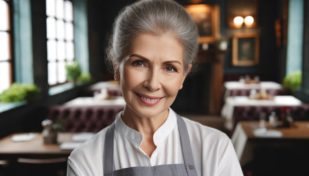 Close-up of a woman wearing an apron in a quaint cafe. She has a joyful expression on her face, with the cafe in the background. This image is perfect for marketing a cafe.