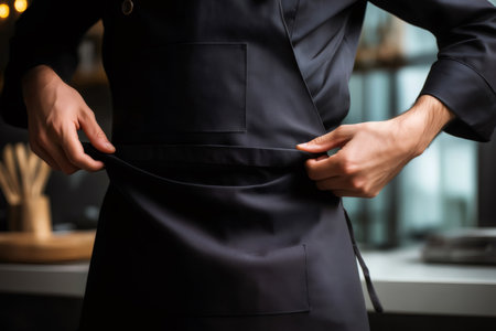 Chef kitchen apron. Chef cook in a uniform, kitchen apron, wearing protective apparel, culinary environment, food service setting, chef in kitchen interior, apron mock-up. Realistic style photo