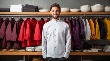 Portrait of a smiling male seller standing in a clothing store.