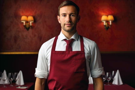 Portrait of a handsome young man in apron. Restaurant.