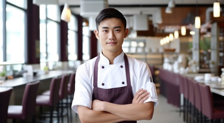 a young Asian chef smiling restaurant.