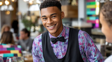 Young waiter smiling and interacting with a customer in a busy and modern restaurant, providing excellent and friendly service