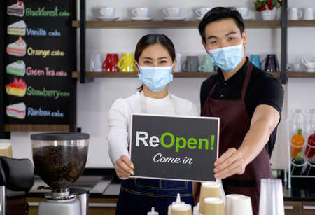 The shopkeeper and barista, wearing a face mask, holds an ReOpen! sign in front of a coffee shop counter. Morning atmosphere in a coffee shop.