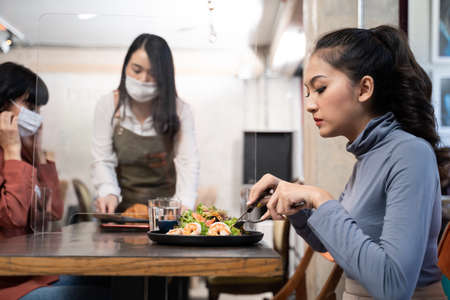Group of customer dining in restaurant. Waitress with face mask preparing food for customer sit on social distancing table for new normal lifestyle in restaurant after coronavirus covid-19 pandemic.