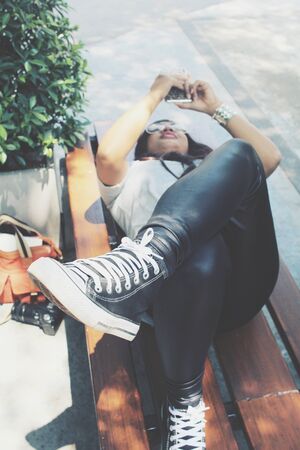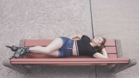 Happy joyful young woman wearing roller skates lying on bench with raised legs. Bizarre high angle