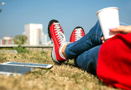 Girl in Jeans and Red jacket and Shoes relaxing in Park