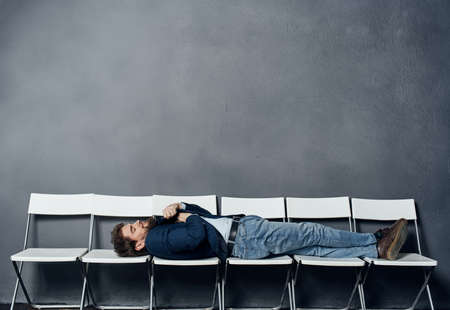 A man lies on chairs waiting for an interview job manager professional
