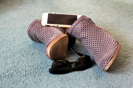Woman's shoes, phone and sunglasses