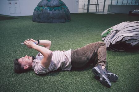Happy man traveler lying on green lawn and relaxing at sunset time