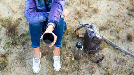 girl on the nature with a bottle and a backpack drinks warm tea