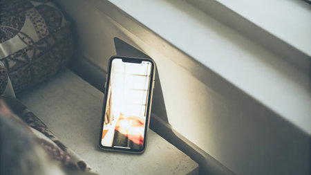 Modern smartphone with sunlight reflection on a windowsill.