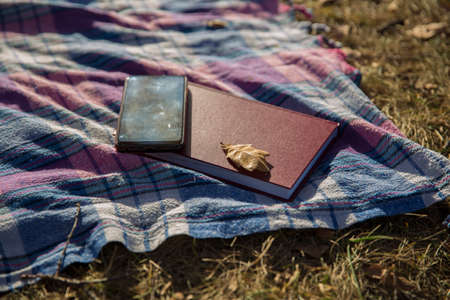 blanket book phone leaf on the grass
