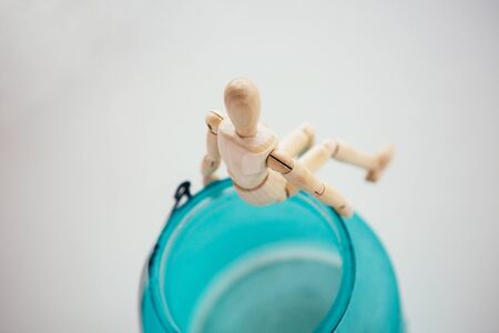On the brink. Loneliness. The figurine of a wooden man sitting on the edge. Conceptual image about psychological experiences.