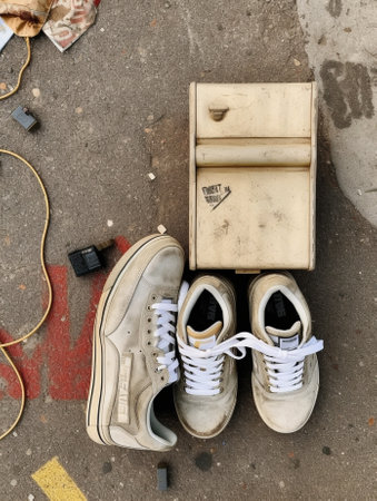 Generative AI : pair of dirty white sneaker on cement floor