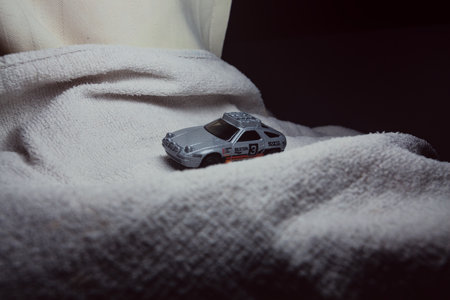 Mantua, Italy - 4TH JANUARY 2025 - Hot Wheels replicas of two Mazda 787B in race livery on white board, bordered by white rolls of fabric, pretending to make a curve on a road and having a race between them