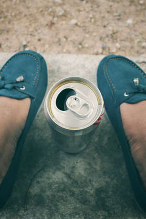 Selfie of shoes, camera, passport and ticket on concrete floor