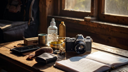 Flat lay of workspace with camera, coffee cup, notebook and earphones