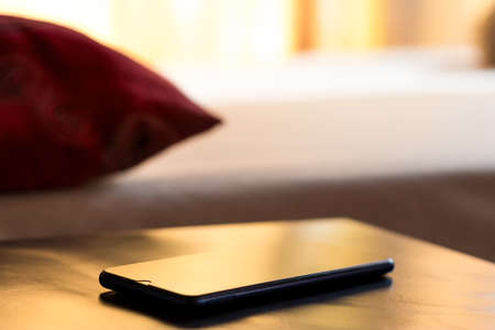 Black smartphone on the nightstand near the bed in the morning. Wood bedside table.