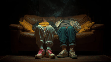 Young couple sitting on the sofa in the dark and smoking a cigarette