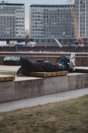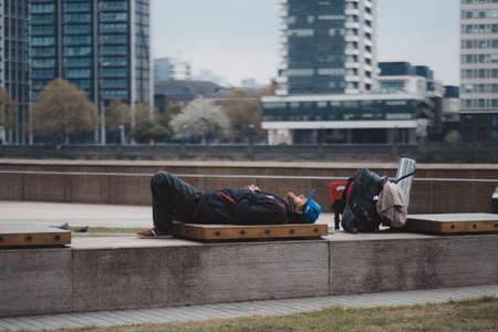 Westminster, London | UK - 2021.05.02: Tired man lies on the bench at the embankment park with his backpack next to him