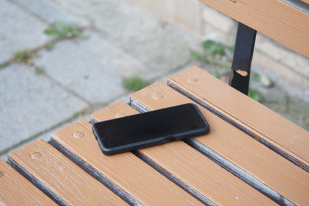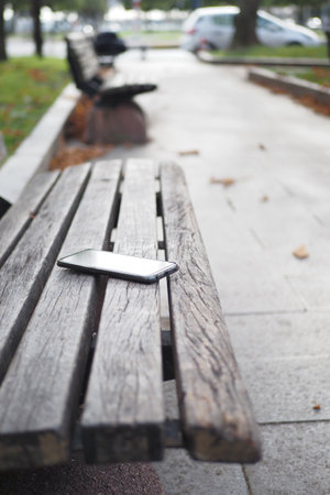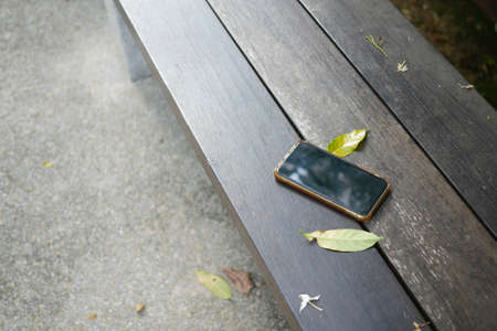 Phone resting on a wooden bench in a public space. lost smart phone concept