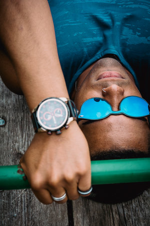 The young fit man with sunglasses and a blue shirt working out in the park while listening to music