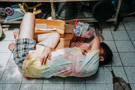 Homeless man sleeps on the street , Bangkok thailand.