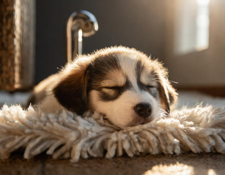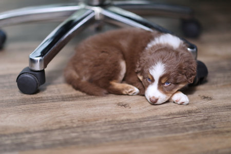 Australian shepherd puppy sleeps peacefully on a floor, enjoying a moment of tranquility