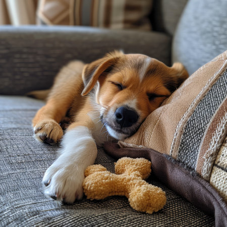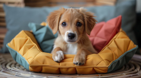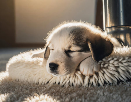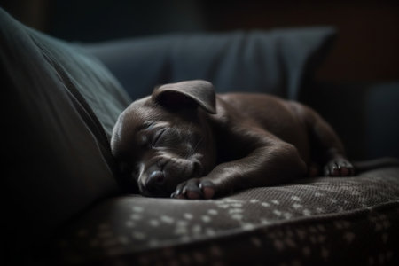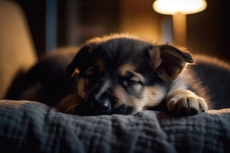 A sleepy puppy snoring softly in its bed. AI generated illustration