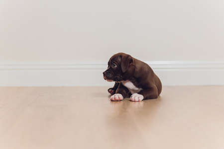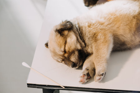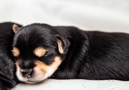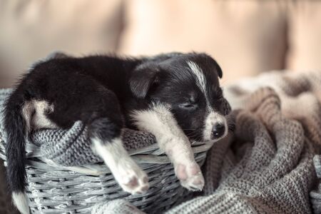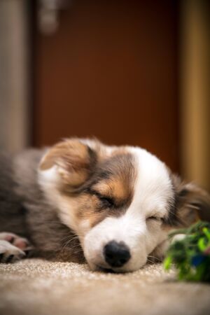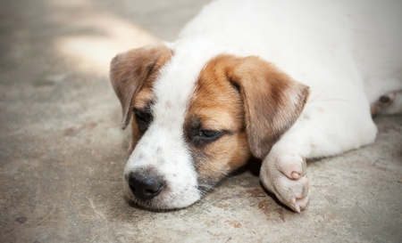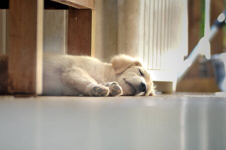 cute sleeping puppy be calm. 1 month old dog rest on house pavement floor
