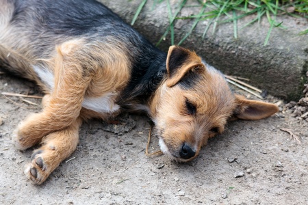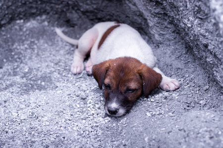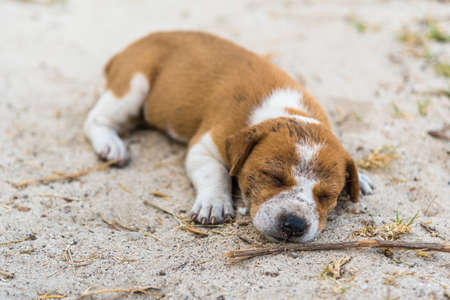 Cute sleeping street dog puppy. Small puppy dog Sleeping on the Market road in India. Home less Street dog puppy lying.