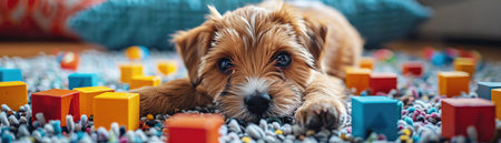 A cute puppy lying on a carpet surrounded by colorful toy blocks, looking directly at the camera