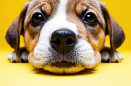 Puppy nose macro shot. Isolated, yellow backdrop. Cute, funny dog detail.