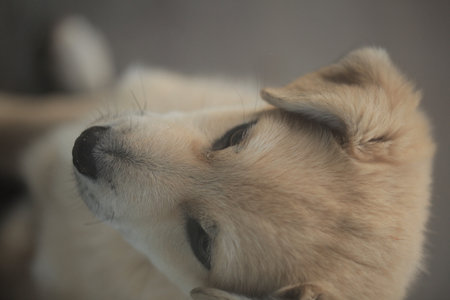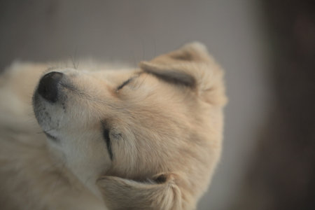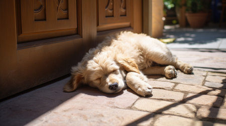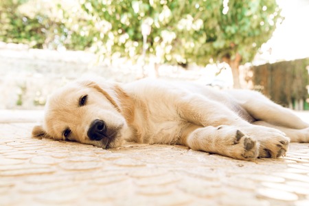 Little dog Golden Retriever is sleeping on the cement floor detail art blur