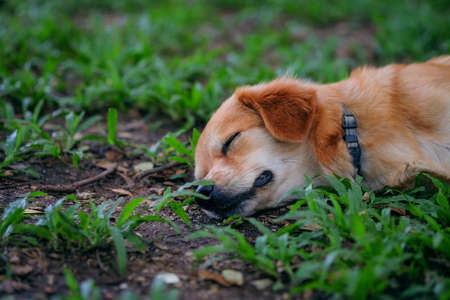 Close up the head of hybrid dog sleeping on the ground. Selective Focus.