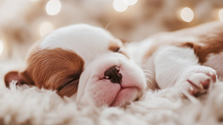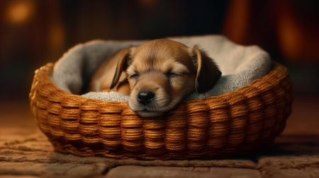 A charming puppy peacefully sleeping in a cozy basket filled with soft blankets. This serene moment captures the essence of innocence and warmth.