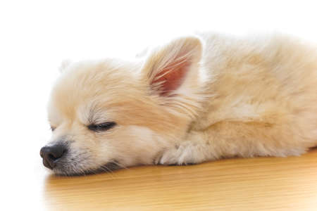 Pomeranian puppy sleeping on the floor isolated on white background.