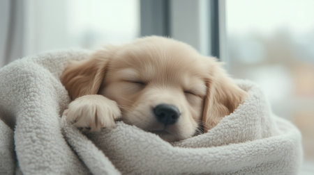Sleeping golden retriever puppy wrapped in blanket. comfort and innocence