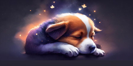 A cute and adorable puppy is sleeping under night sky between stars pillow. Generative AI AIG16.