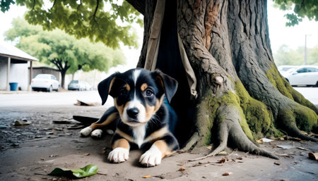 A black and tan puppy with soulful eyes finds solace under a large trees roots on a deserted urban street.. AI Generation