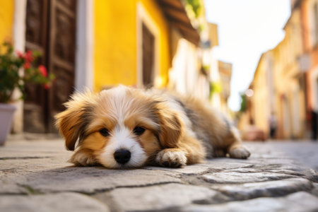 Adorable puppy relaxing on the pavement during a beautiful sunset, creating a heartwarming scene. Ai generated