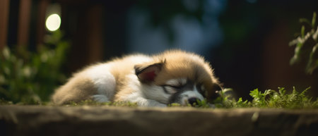 Adorable friendly dog peacefully sleeping under the stars at his home backyard garden lawn, quiet night of relaxing dreams and rest, closeup portrait bokeh blur - Ai generated