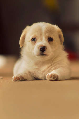 Close-up of a lying puppy dog. Adorable golden retriever puppy looking at the camera