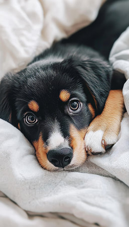 Adorable Black And Tan Puppy Relaxing On White Bedding, Perfect For Pet Related Content